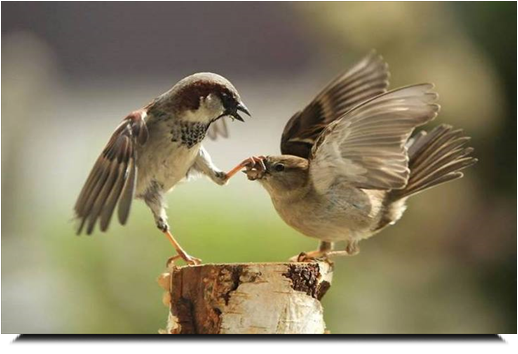 Wie veel mussen in de tuin heeft is gelukkig. Het is een levendig stelletje en ze zijn altijd in de weer. De terugloop staat stil, gelukkig, want ze horen echt bij ons. Mocht ik eerder zeggen dat de vrouw de broek aan heeft tijdens het broedseizoen, het gaat niet altijd op, er zwerft een foto rond op het internet die dat duidelijk aangeeft. Het commentaar op deze foto zal veelvuldig zijn. Het is dan ook een gouden shot! "Vrouw, NU even je snavel dicht"